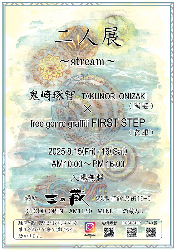 2025-08.15(Fri).16(Sat)「二人展」~Stream~開催 陶芸家 鬼崎琢智との共同出展となります。会場三の蔵