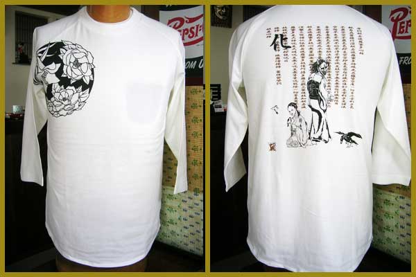 「棘」 恐ろしさ、厳しさ「蜜」 美しさ、優しさFRONTには、芍薬・牡丹・百合(立てば芍薬、座れば牡丹、歩く姿は百合の花)が描かれ、女性の美しき姿を表し、BACKには、「化」の文字が表すように、女性が持つ表の顔と裏の顔を表現しています。