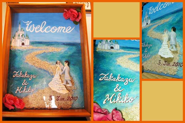 【右】 依頼内容 新婦・・・白無垢に綿帽子 新郎・・・羽織 背景・・・日本の城 メッセージを書いてもらえるようにスペースを大きくとりたい 文字・・・Welcomeではなく「うぇるかむ」 色・・・・・赤・ピンクは極力使いたくない(新婦が好きじゃない) 立体は使用せず、平面画でという内容で作らせていただきました。