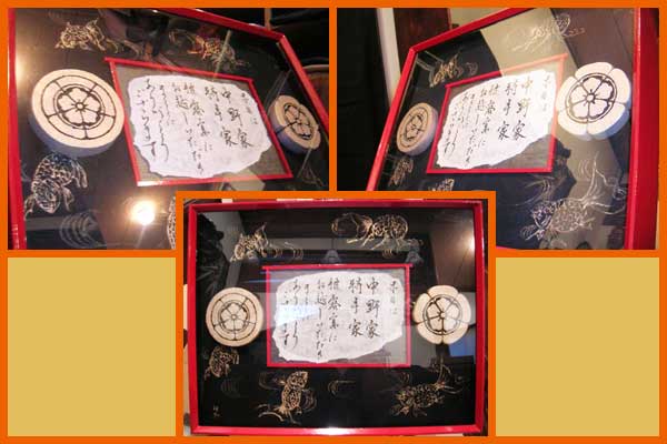 背景黒い部分には、着物で織り柄の入った生地を使い、額、メッセージボード部分には漆を塗ってあります。
